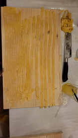 A long table, everything laid out: board, flour, rolling pin, egg, knife…